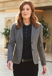 2 patch pockets, topstitch detail seams, plain cuff with vent, plain back.