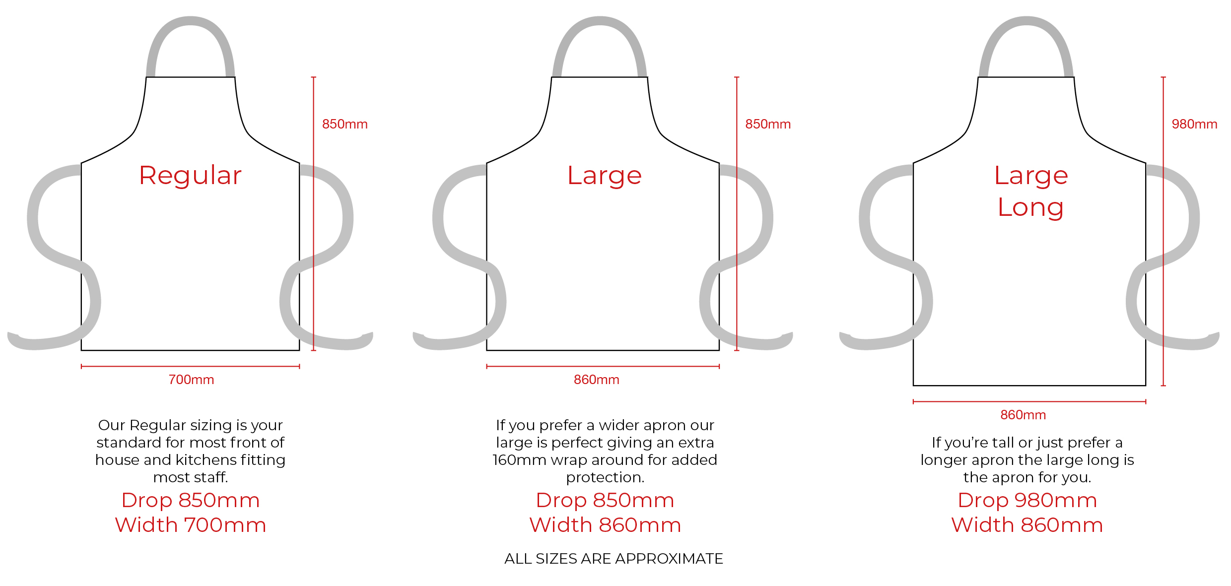 • 100% Ringspun Denim Canvas 300gms Fabric 700mm* x 850mm (270mm bib width*) *Aprons available in large and extra large widths.